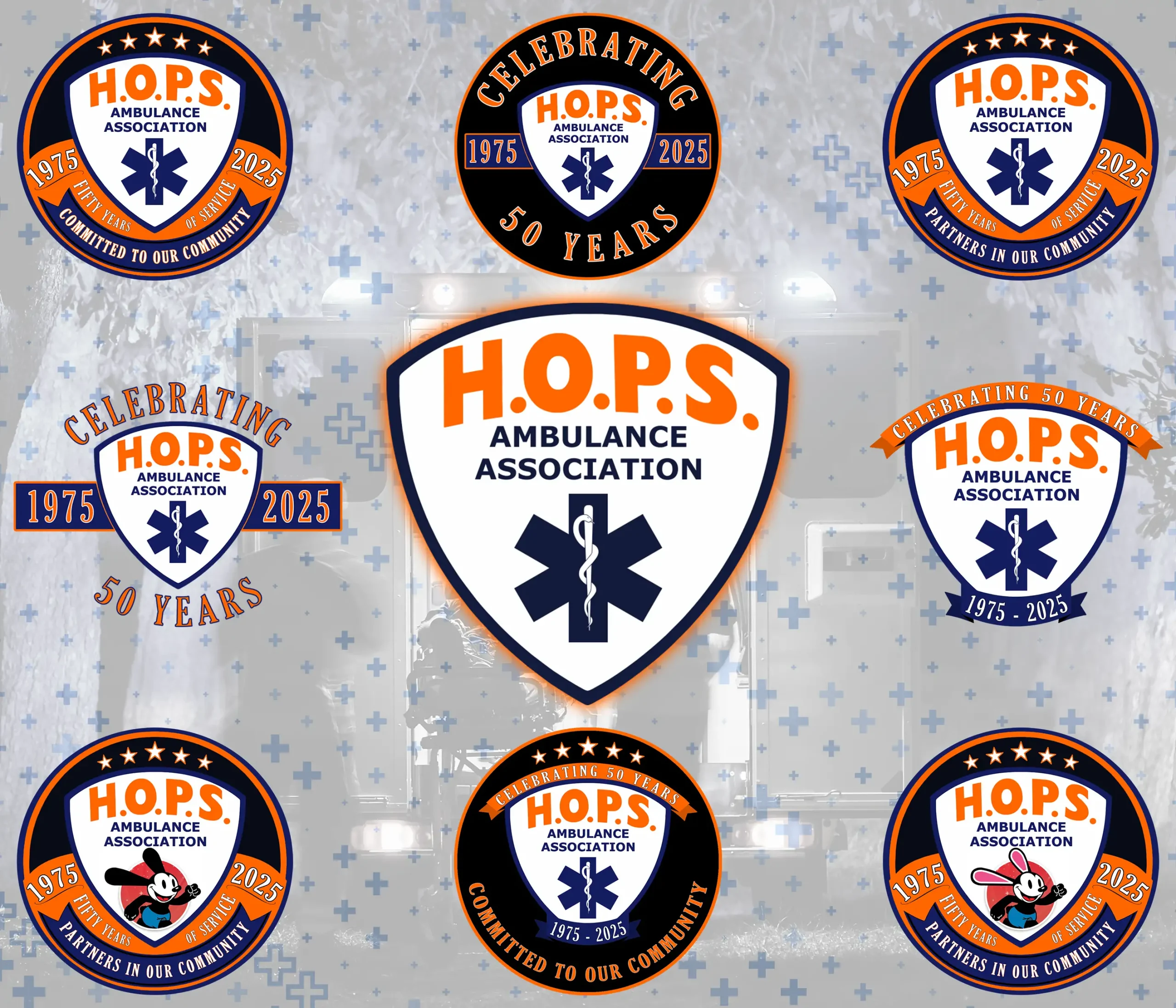 2025 Marks the 50 year anniversary of HOPS Ambulance Service. Founded in 1975, HOPS Ambulance serves multiple communities within Bradford County, Pennsylvania. The Association requested a special anniversary logo to celebrate 50 years of service to their community.